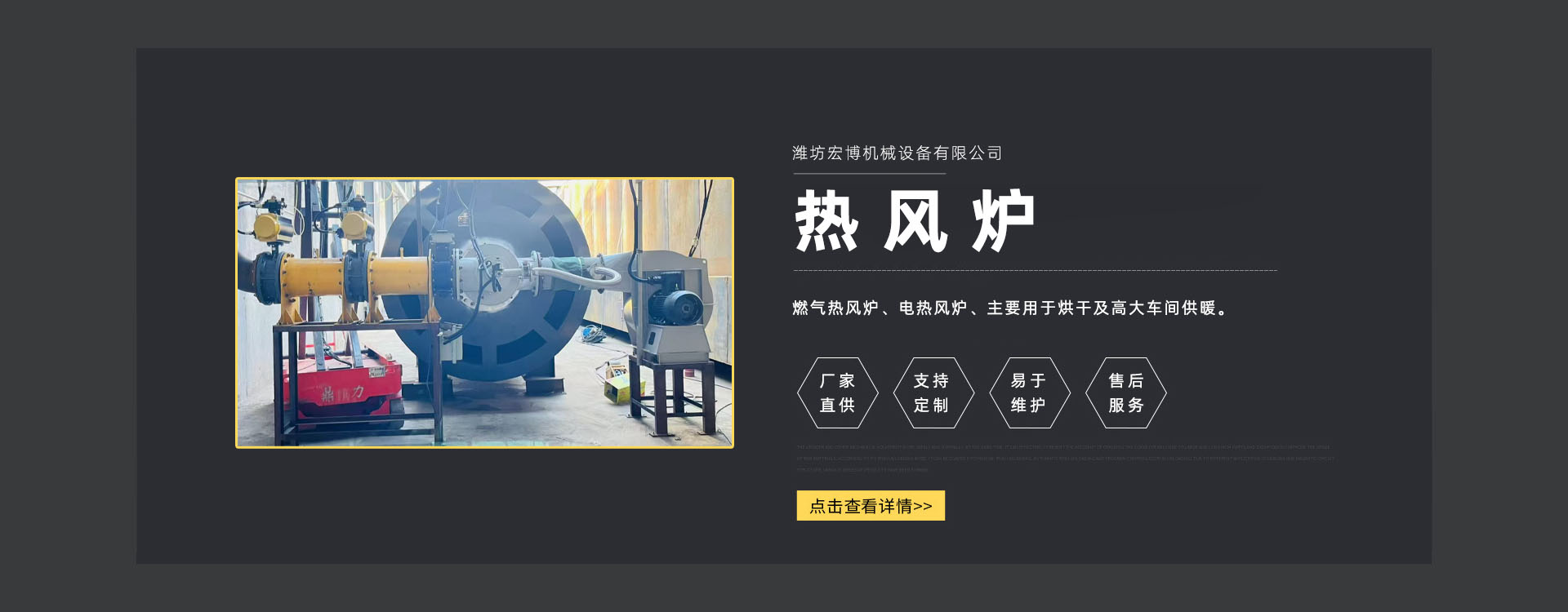 濰坊宏博機(jī)械設(shè)備有限公司是從事熱風(fēng)爐、烘干設(shè)備、供暖設(shè)備的研發(fā)、設(shè)計(jì)、制造和服務(wù)于一體的實(shí)體企業(yè)。長(zhǎng)期以來(lái),企業(yè)以市場(chǎng)的發(fā)展和客戶(hù)的需求為導(dǎo)向,集多年的生產(chǎn)技術(shù)與經(jīng)驗(yàn)為一體,不斷開(kāi)發(fā)和優(yōu)良產(chǎn)品。